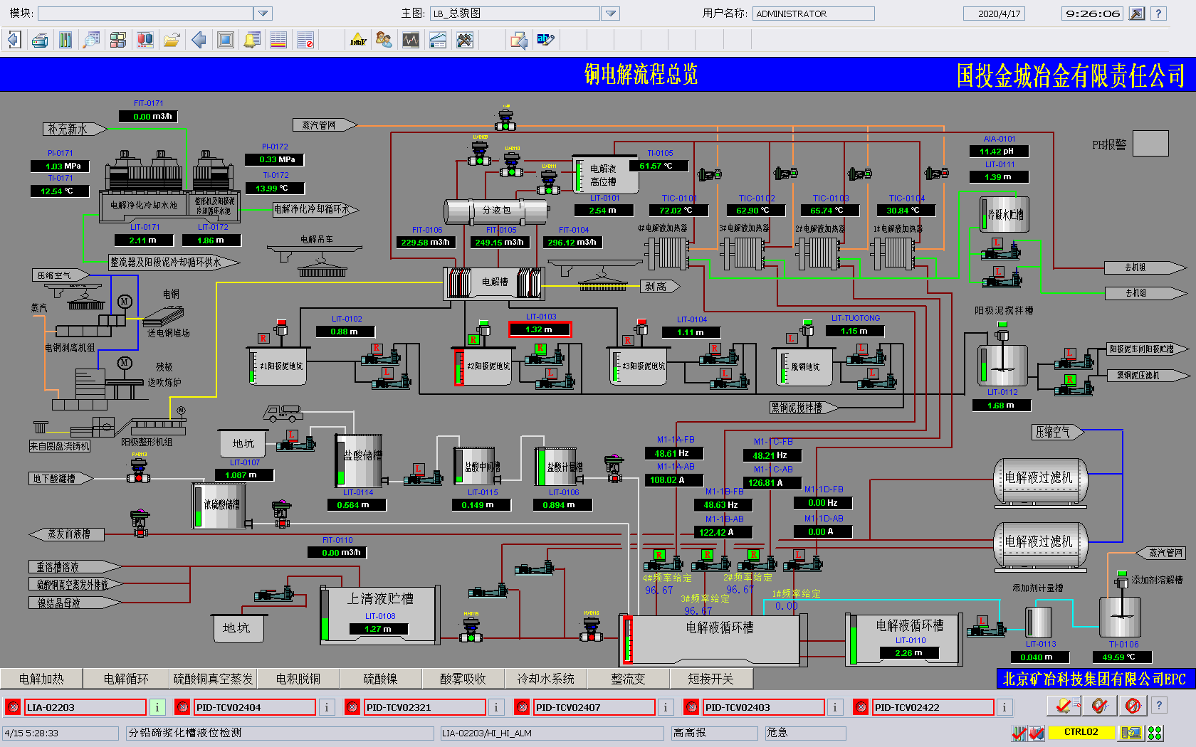 由toto彩票 总承包的湿法电解区域EPC工程总承包位于河南省灵宝市豫灵镇,生产流程为火法冶炼产出的粗铜,经过电解精炼产出精铜,阳极泥湿法综合回收贵金属。该工程包括电解车间和阳极泥处理车间,两车间相互独立,各设置一套DCS控制系统,均采用冗余控制器+工程师站+操作员站的架构,通过环网联通整个系统。采集的实时生产数据集中归档,并设置一台OPC客户端用于和全厂生产信息管理系统联网,实现全厂资源统一管理。DCS系统针对电解车间电解液加热调节阀频繁,设计带蒸汽压力前馈的PID温度调节,针对添加剂槽蒸汽大,重新设计仪表测量系统,稳定投料速度,减少表面凸瘤和粒子的产生。集成阳极整型机组、天车定位、电解槽短接开关系统、电解液循环过滤系统、阴极剥离机组、残极洗涤机组、真空蒸发机组等子系统,集中显示调配关联数据,方便工艺监控生产过程。