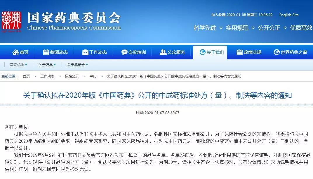 据了解,根据《中华人民共和国标准化法》和《中华人民共和国中医药法》规定,强制性国家标准须全部公开。国家药典委员会于2019年9月29日在官方网站发布了拟公开的品种名单后,收到部分企业提供的有效保密证明,这部分品种按国家保密品种处理。而除国家保密品种外,国家药典委员会对《中国药典》一部收载的中成药标准中未公开处方与制法的实行全部公开。