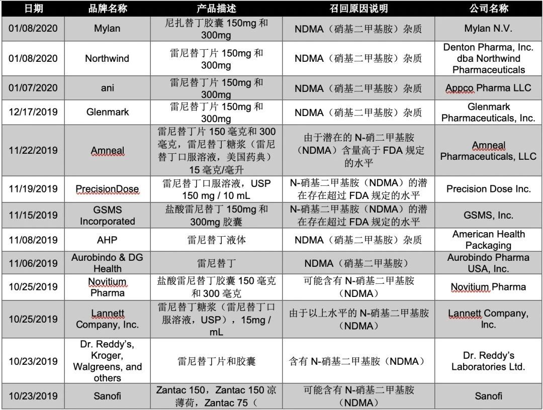据不完全统计,截至目前,诺华、GSK、赛诺菲、梯瓦、瑞迪博士等多家药企已经对雷尼替丁进行召回。