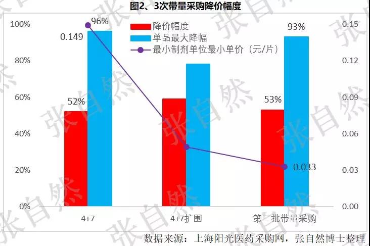 从4+7试点、4+7扩围到本次集采,降价幅度分别是52%、59%和53%;中选品种的最小制剂单位的最低价也分别由4+7试点和4+7扩围时的0.149元/片(浙江京新的苯磺酸氨氯地平片5mg)、0.049元/片(齐鲁的利培酮片1mg),下降到本次的0.033元/片(华中药业的对乙酰氨基酚片0.5g),本次较4+7时的0.149元/片又下降了78%。单品最大降价幅度分别由4+7试点和4+7扩围时的96%和78%到本次的93%。