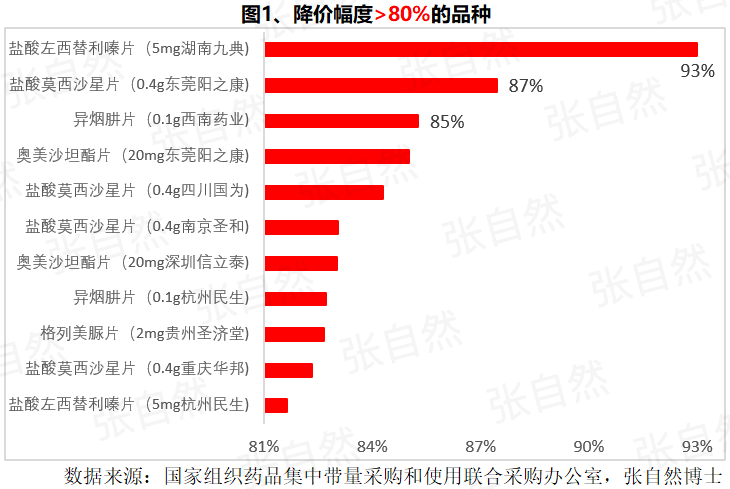 本次集采平均降价幅度为53%,与4+7时52%的降幅基本持平,其中,外资原研药平均降幅82%,仿制药平均降幅51%。较最高有效申报价降幅最大的是湖南九典的盐酸左西替利嗪片(5mg)的93%,降幅最小的是成都倍特的氟康唑胶囊(50mg),降幅为11%(图1),与4+7时7%~96%的单品降价区间相近。知名外企拜耳,直降78%,以0.18元/片的低价一举夺得阿卡波糖的中选权,成为本次集采最大的爆点。