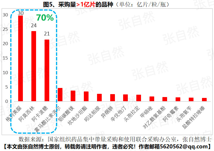 本次中选品种的总采购量约110亿片,其中,采购量最大的是格列美脲30亿片,采购量最小的是安立生坦片,仅3万片,而格列美脲、阿莫西林和阿卡波糖3个品种就占了总采购量的70%(图5),同样是中选,而格列美脲的量却是安立生坦的10万倍。