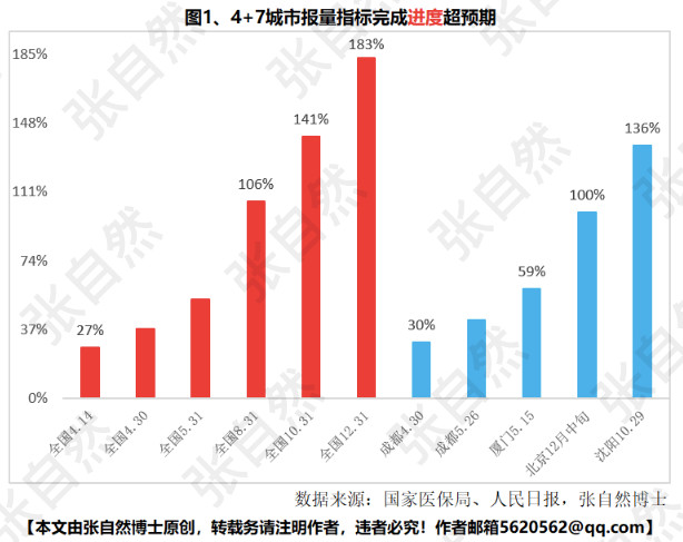各个试点城市自身的指标完成进度也较理想,以试点城市厦门为例,去年5月15日4+7实行才一个半月的时间,厦门即已完成了全年指标的59%,到10月29日,沈阳则已完成全年指标的136%。