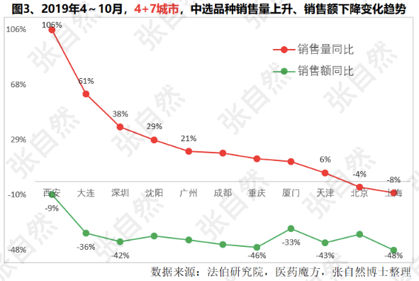 再来看中选品种在4+7城市的总体销售表现,除上海和北京外,其他9个试点城市全部实现了销售量的上升,其中,销量上升幅度最大的是西安,增幅高达106%,也可能与西安报量较小有关。