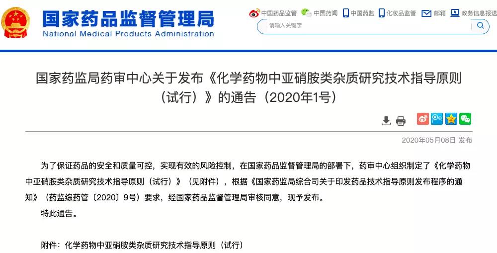 5月8日,国家药监局药审中心发布《化学药物中亚硝胺类杂质研究技术指导原则(试行)》(以下简称《指导原则》)。