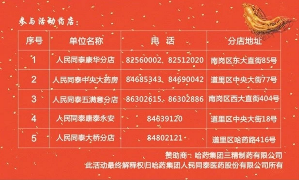 随着哈尔滨市广场舞大赛的完美谢幕,人参蜂王浆、刺五加王浆口服液三赠一产品动销活动也随之启动。三精蜂王浆系列产品优惠活动在人民同泰正式开启,消费者在2018年10月10日——10月31日期间在以下人民同泰药店购买三精牌人参蜂王浆、刺五加王浆口服液,即可享受买3赠1的优惠。