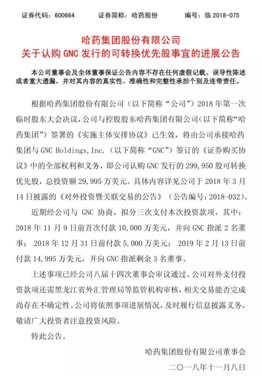 【哈药公告】toto彩票 关于认购 GNC 发行的可转换优先股事宜的进展公告