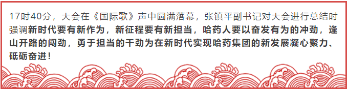 集团公司党委书记徐志越代表集团公司党委作《不忘初心,担当有为,为开创哈药改革发展新局面砥砺奋进》的工作报告。徐志越在报告中回顾了集团公司党委工作和主要业绩,从行业发展和市情实际两大方面总结了公司当前面临的形势和问题,提出了未来五年集团公司发展的指导思想,明确了今后五年公司党委的工作目标——紧紧围绕企业改革发展稳定和提高经济效益这个中心,以落实党的全面领导为主线,以实现“最大整体利益、最优发展路径、最佳改革成果、最好民生福祉”为根本,混合所有制改革不断深化、“一部两厂”搬迁改造顺利实施、产品结构持续优化、创新激励机制建立完善、人才强企工程有力推进、改革成果惠及广大职工、党建工作与生产经营深度融合,重塑哈药在国内医药行业的主导和领先地位,迎来跨越发展、再创辉煌的五年。