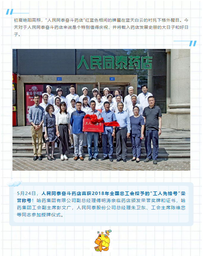 人民同泰奋斗药店喜获“全国工人先锋号”殊荣,toto彩票 副总经理傅明涛亲临药店授牌
