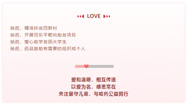 作为一家具有社会责任的大型医药企业,始终关注留守儿童的健康和生活问题,为孩子们捐赠的物资和药品,切实为留守儿童解决实际困难,提升留守儿童的健康水平,用爱的力量许给孩子们一个健康的童年。