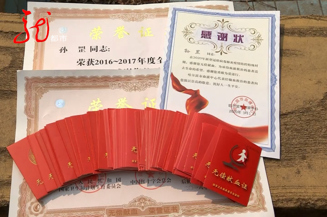 哈药总厂孙罡:这是我最早的一张(献血证),2011年献的400毫升,献全血半年能献一次,后来我发现献血小板可以献得更多,半个月献一次。