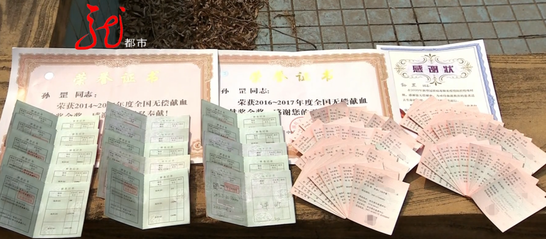 咱们先从孙罡这些证书的第一本说起,这一本本红色的证书,记录了孙罡近十年的献血之路。